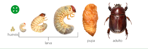 Los escarabajos, al igual que las mariposas, realizan metamorfosis en su ciclo de vida; la chiza es la larva que proviene del huevo del escarabajo. En este caso, la chiza no se parece a sus padres porque tiene características diferentes.